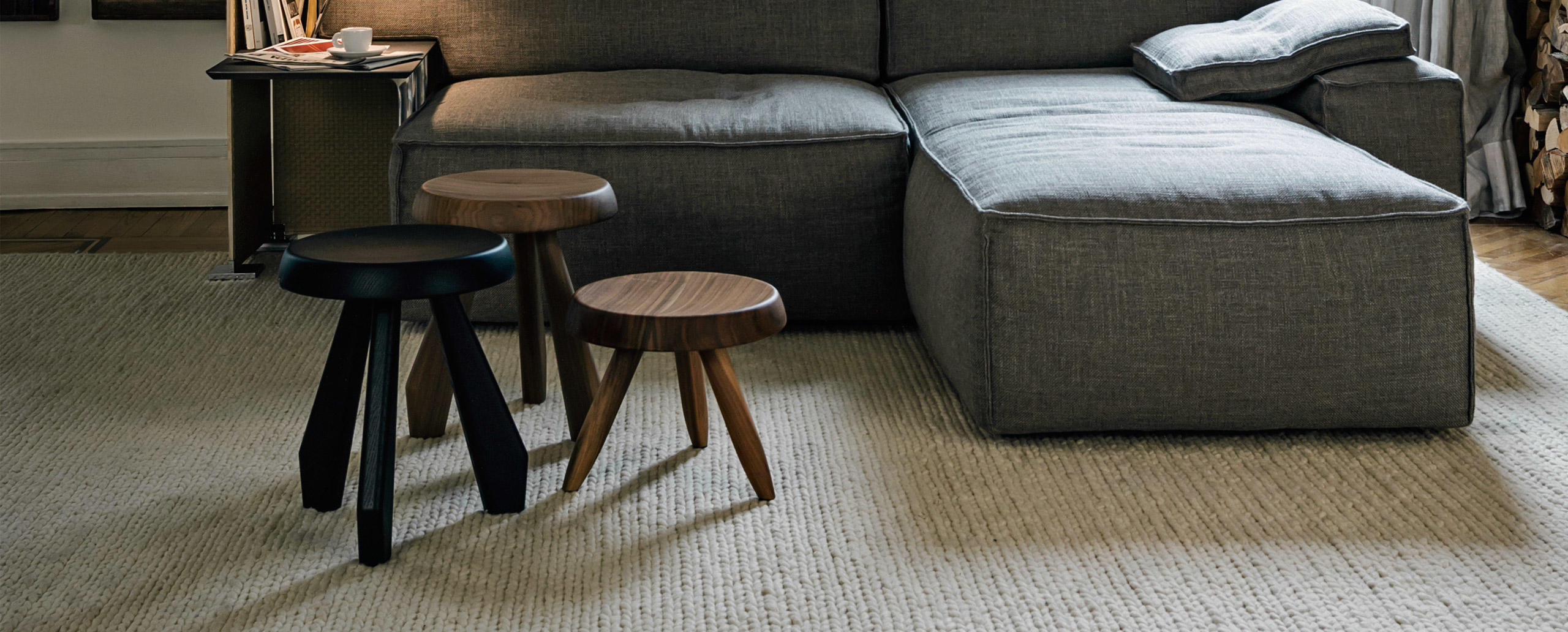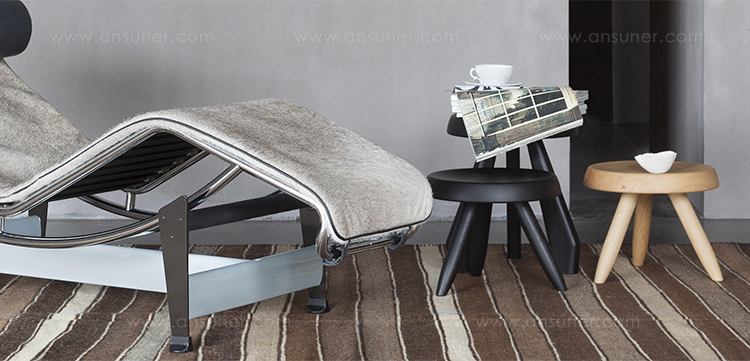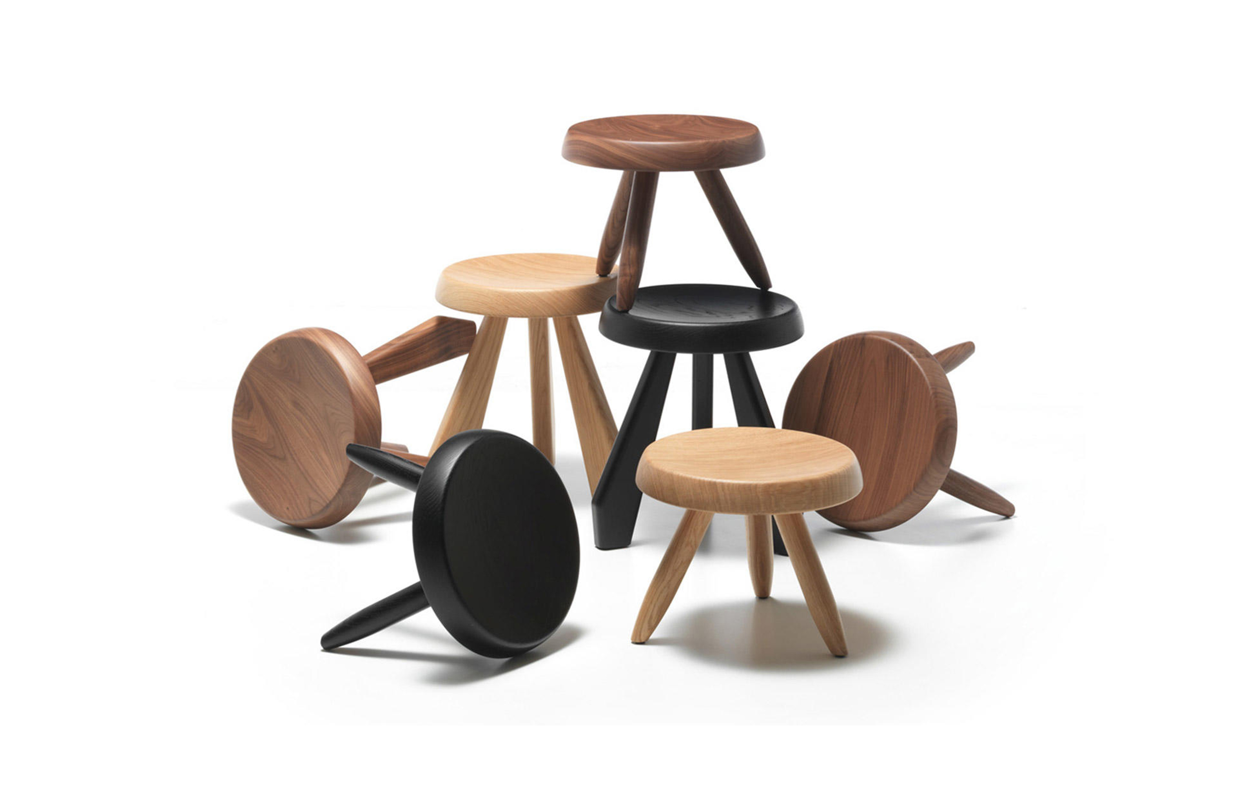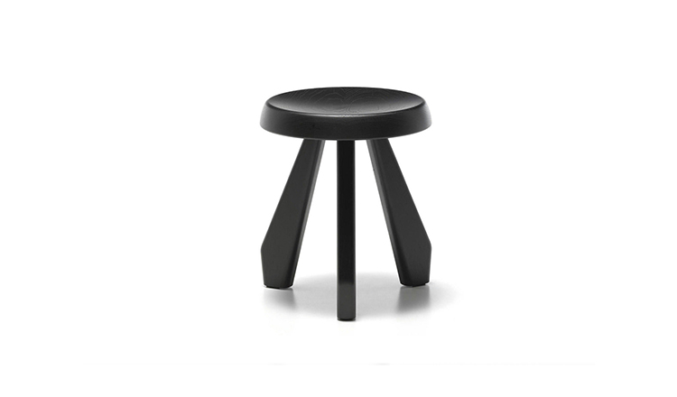 Tabouret Meribel 高脚凳,得名于Charlotte Perriand在法国美贝尔的度假屋。Perriand在这里工作和生活,多年来,她重新诠释了当地的建筑风格。这把凳子材质简单,从阿尔卑斯山的建筑风格中获得灵感。该凳采用三条“刀把型”凳腿,提供三种不同实木饰面:天然橡木、哑光黑色橡木和天然美国胡桃木。