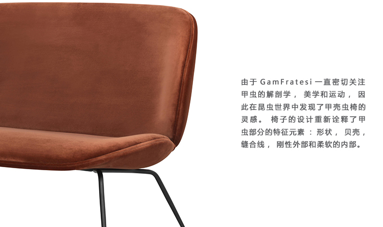 从甲壳虫沙发椅子中得到灵感,细长的甲壳虫沙发有一个圆形、保护性的外壳和一个柔软的内部——就像甲壳虫一样。两人座的甲壳虫沙发与环绕的外壳和柔软、诱人的内饰形成对比,鼓励人们坐下。