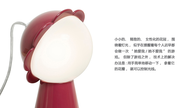 小小的、精致的、女性化的花冠,围绕着灯光,似乎在提醒着每个人迟早都会做一次“她爱我/她不爱我”的游戏。但除了游戏之外,技术上的解决办法是:用手简单地移动一下,拿着它的花瓣,就可以控制光线。这种灯有六种颜色可供选择。