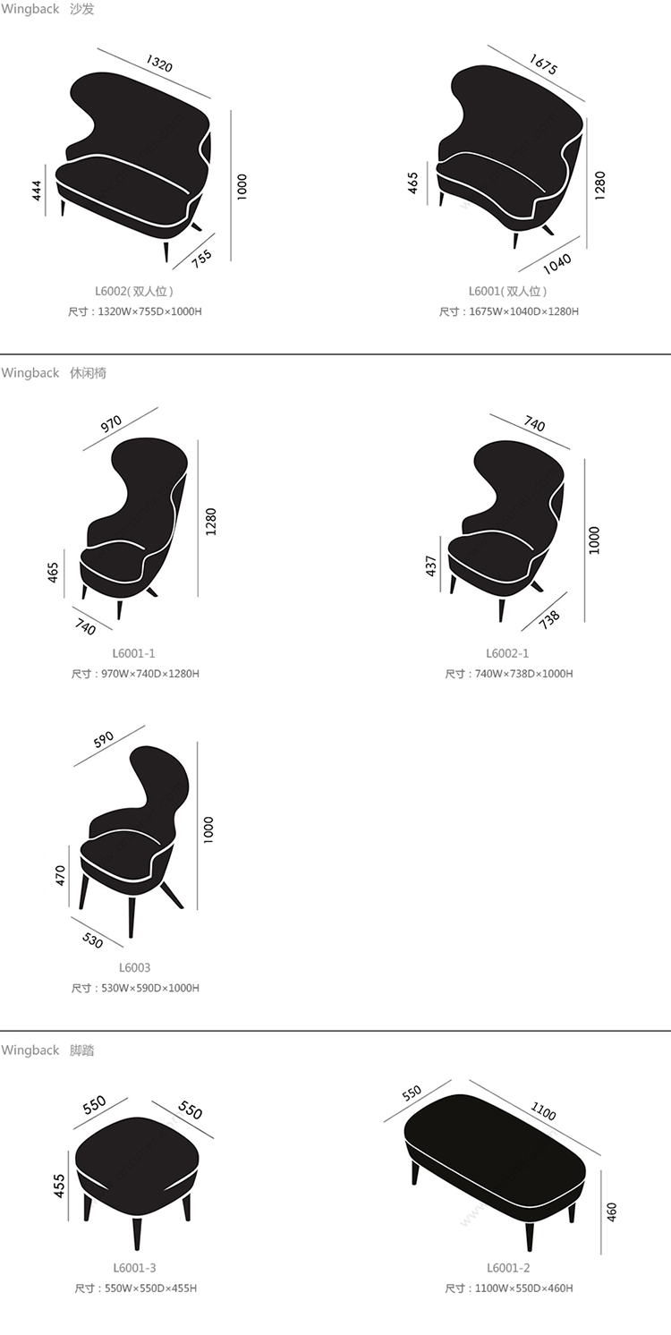 Wingback 沙发 系列尺寸/示意图