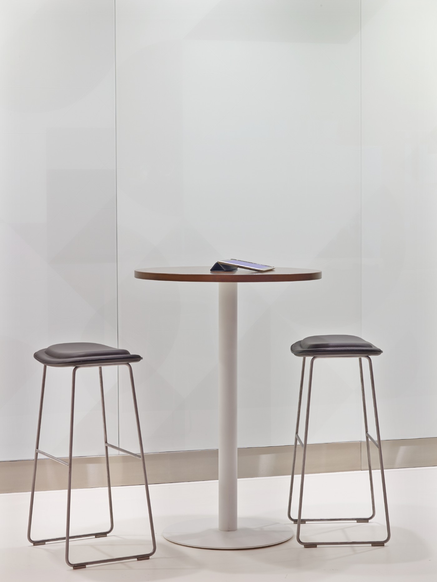 凳子坐在山毛榉和桦木胶合板,multi-density聚氨酯泡沫。 固定在面料和皮革的集合. 基地缎不锈钢、聚丙烯的脚.