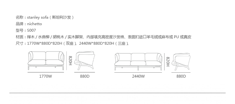 Stanley沙发系列是意大利著名设计师Luca Nichetto 为伦敦家具厂商 De La Espada打造的。沙发椅则展示了 De La Espada 精湛的制木工艺,从羊毛椅面与扶手连接处的细节就可看出。实木脚架精妙地固定着坐垫和靠垫,并巧妙的隐藏在衬垫里,外露的脚架同时展示了高超技艺和木材的优质。制作采用榉木/水曲柳/胡桃木/实木脚架、内部填充高密度沙发棉、表面扪进口羊毛绒或麻布或PU或真皮。