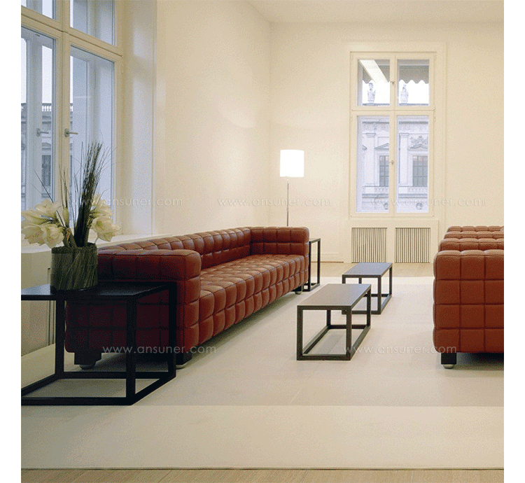 This high quality reproduction of the Josef Hoffmann Kubus Sofa features a handcrafted hardwood frame graciously lined with polyurethane foam.The surface is luxuriously soft to the touch, compliments of its premium 100%Top-Grain Aniline leather upholstery. This premium reproduction is generously proportioned to original full-scale size and cube count.Precision stitched & aniline leather piped tactile cubes create a thick body of cushioning that is so comfortable you’ll understand why this sofa has been a modern classic for nearly a century.For those looking for historic significance in midcentury modern furnishings,the Hoffman Kubus is a certain candidate.