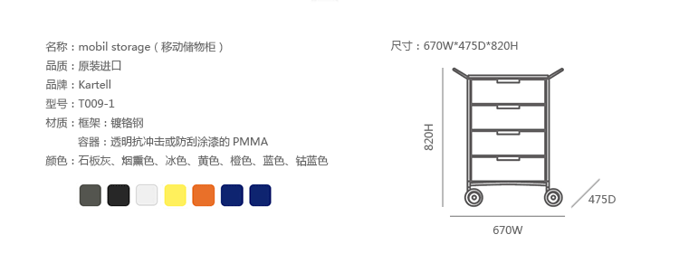Mobil storage(移动储物柜)是由意大利国宝级设计师Antonio Citterio(安东尼·奇特里奥)设计的,他的设计跨越三大洲,已成为设计领域最活跃的渊博人士,1972年,他与著名品牌Arclinea厨具、flexform、Flos灯具等合作,1987年,为B&B设计的座椅获金罗盘奖.Mobil取自移动机制知名,带有随处收纳、移动变幻的多元满足,以多层抽屉式的收纳,搭配置物层版,不论是作为床边柜、工作室文件抽屉、生活收纳等,都非常合适。此外,另可选择滑轮式样、或是固定式座脚,自在搭配。
