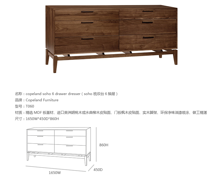 copeland soho 6 drawer dresser(科普兰soho 6抽梳妆台)是Copeland Furniture公司copeland实木系列之一。我们塑造环境,然后环境塑造我们,copeland旨在传递的舒适度和清晰度的感情。设计借用了一些最优秀的传统和当代的设计要素,非常具有特色。这个中世纪现代风格的设计,提供了6层平滑抽屉存储空间,可以使您更好的归纳自己的物品,提供大量存储空间。制作采用精选MDF板基材、进口美洲胡桃木,贴面、实木脚架、彩色装饰边、环保净味油漆喷涂、做工精湛。