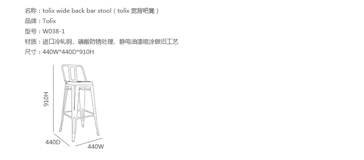 tolix chair(tolix椅)一把有味道、有态度的椅子,据说它最开始被使用在一艘战舰的天气预报房间里,故事的真实性与否不得而知,但是不影响其成为享誉世界的著名设计家具,1934年由Xavier Pauchard设计,早期是作为户外用家具设计,力图展现法式慵懒而闲适的气质,经年而来被全世界时尚设计师所宠爱,从室外扩展到家居、商业、展示等多个用途,而此椅也不负众望在各类空间中均有上佳表现,特别是近年来与混搭、乡村、美式、怀旧、北欧简约、中式等主要装修风格搭配,都呈现出独特的韵味,也被时尚界赞为“百搭第一”椅,可以用在酒吧,餐馆,咖啡馆等等地方,之后通过改进,设计出有扶手版本的tolix armchair(tolix扶手椅),高背版本的tolix high back bar stool(tolix高背吧凳),宽背版本的tolix wide back bar stool(tolix宽背吧凳),及tolix bar stool(tolix吧凳)和tolix mini stool(tolix迷你凳)。制作采用进口冷轧钢、磷酸防锈处理、静电油漆喷涂工艺、坐面为木板或PU海绵坐垫,颜色可选。