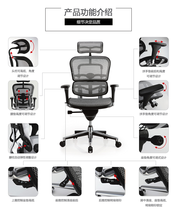 全球首创的单杆式操控底盘,一根杆操控所有功能,使办公椅的操控更加人性化;自动弹性腰枕支撑系统,无论是在坐下时、工作中、或者后仰时,都能让使用者的腰和背获得最舒适的支撑;金豪+系列采用完全性多功能调整设计,从椅背、扶手与座垫可进行全方位的调整;