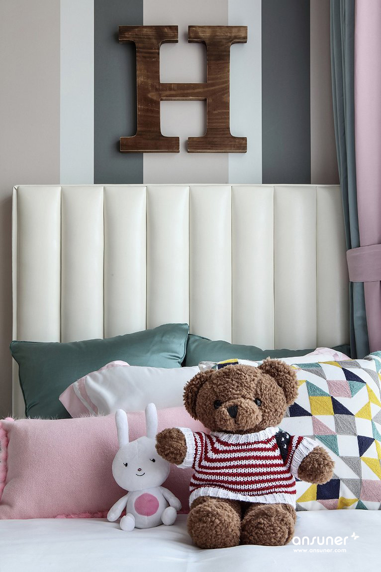 在女儿房设计中,经由马卡龙色调的清甜组合,一个甜美温馨的童话乐园于此诞生,柔软温暖的的拼布地毯上,安放着粉白相间的小床,可爱的动物们相伴左右,一切的一切,仿佛都在共同制造着童年轻快的幻梦。一个浪漫的水晶饰品吊灯,散发出纯净通透的光,让甜蜜浪漫在空间萦绕着。