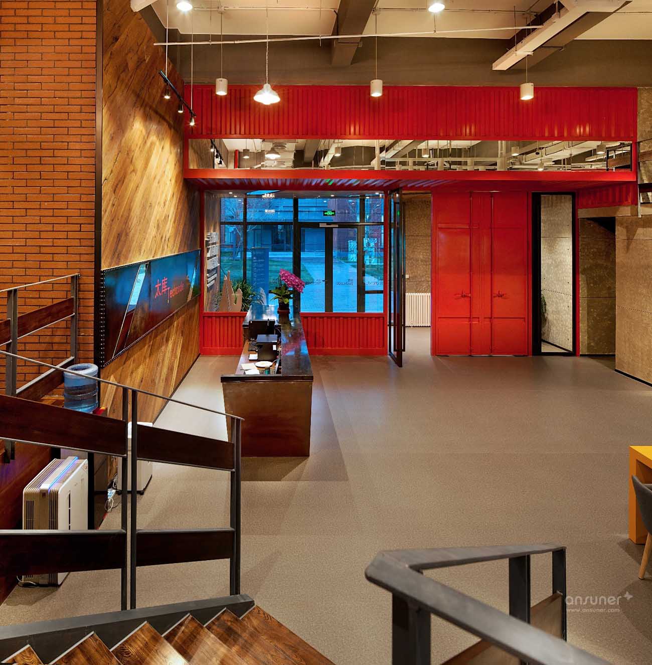 入口处醒目的大红色门厅,墙壁饰面采用集装箱纹理,与接待台后的木色饰面即形成了鲜明对比,同时又烘托出了温暖、开放的环境氛围,独特的工业风格特色让人第一眼就留下深刻印象。铁制的接待台经过特殊锈化处理,展现出了斑驳仿旧的视觉效果。