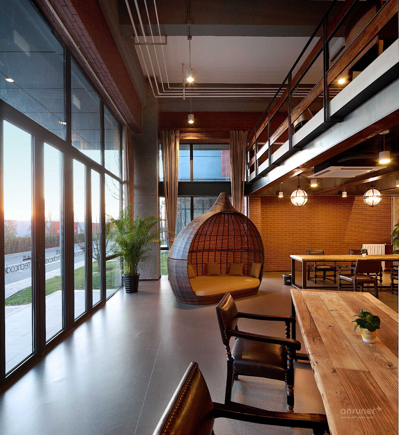裸露的混凝土结构讲述着这里的历史,木材的质感传达出温暖与热情,绿植的点缀营造了舒适自然的环境。略带复古的氛围,让人能够瞬间放松心情。沉稳的铁艺栏杆穿插其间,既保证了使用功能,又成为环境中的勾勒与点缀。