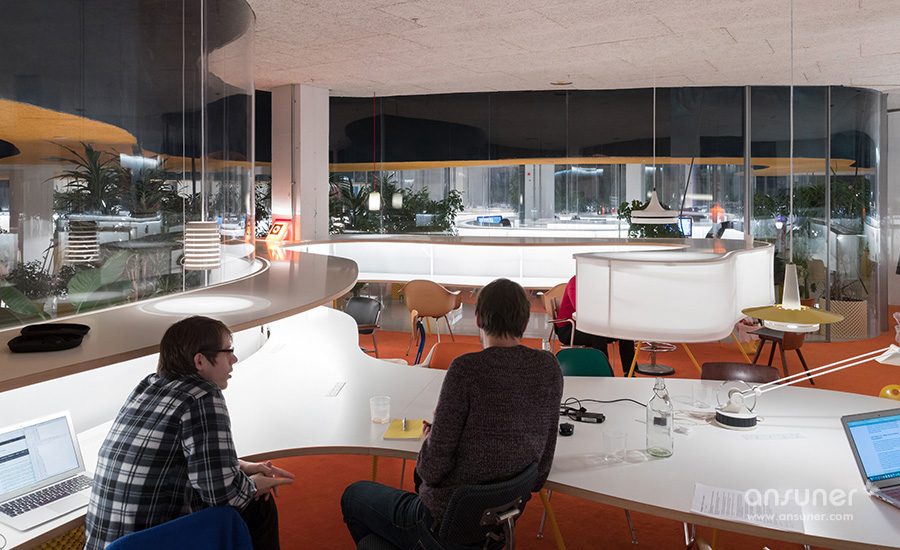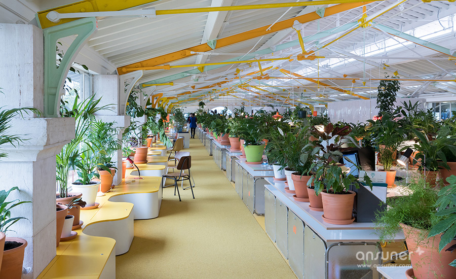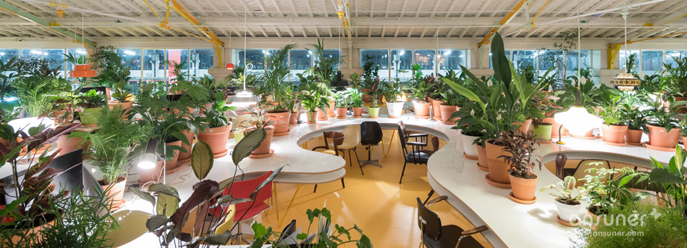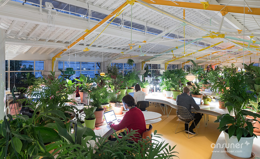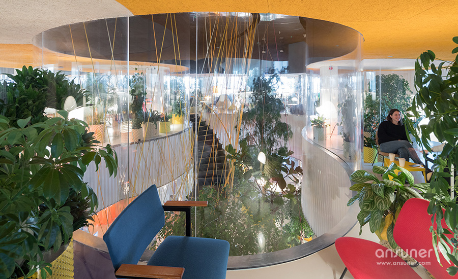 设计团队使用了1000株植物和树木遍布于整个办公空间。这些绿化不仅用来装点空间,还能有效降低环境噪音、提高空气质量;蜿蜒长桌上的盆栽还充当隔断的功能,保持一定的私密性。室内还整合了500种不同的家具和灯具以营造当地的文化氛围,包括中世纪时期的作品和包豪斯原版家具。