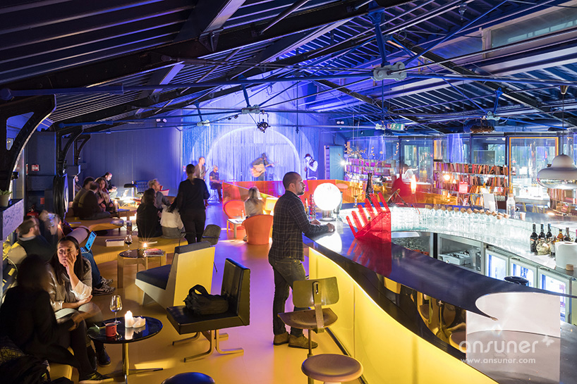 L形的平面创建了两个功能迥异的空间:由弯曲长桌排列而成的工作空间和多元化的咖啡休闲区。这两个区域以完全不同的设计手法和色彩营造各自惬意的氛围。蜿蜒流动的长桌不仅生成丰富有趣的空间形态,也促进了邻里间的互动交流。