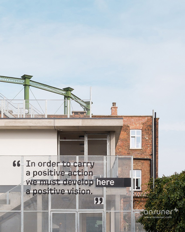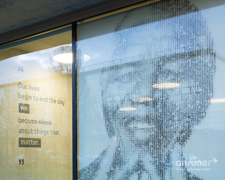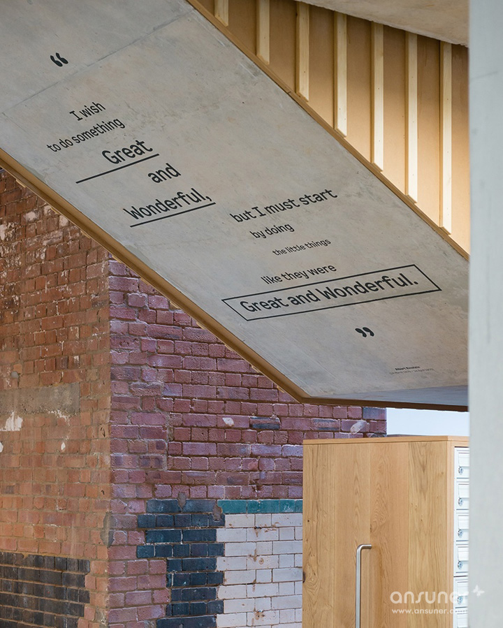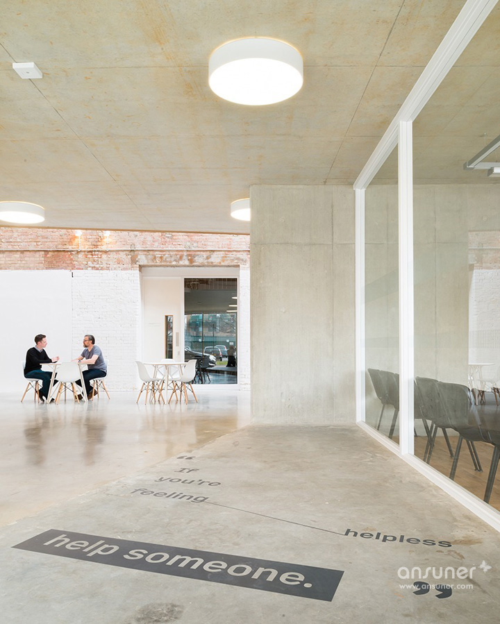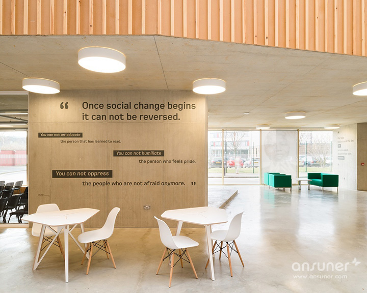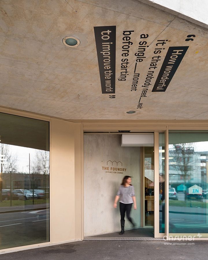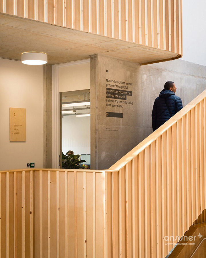 在入口处,由激光切割制作的The Foundry标志贴在混凝土墙面上,移动玻璃门上贴着由山墙建筑演变而成的蓝色造型标注着“进”与“出”的标识。室内的房间编号采用同样的激光切割工艺直接贴在门板上,房门上的公司名称则是可以随时撤换的。窗框的表现形式以重复间隔的木制竖条加以修饰,与室内的楼梯造型遥相呼应。室内空间表现出服务的主题:关注人权。以世界历史从古至今影响深远的思想家与人权领导者的名句构成一个整体的空间故事,并将文字与人物以艺术的手法构筑整个空间氛围,以此映射本案独特的文化思潮。户外楼梯间的透明墙体上装饰着醒目的黑色金属文字,昭告着人们此处的属性。以著名人物马丁路德金、昂山素姬、曼德拉和亚伯拉罕林肯等一系列超大肖像图形,装饰于一楼的会议室玻璃窗上。每个肖像均以其所说的言论以文字图形塑造。