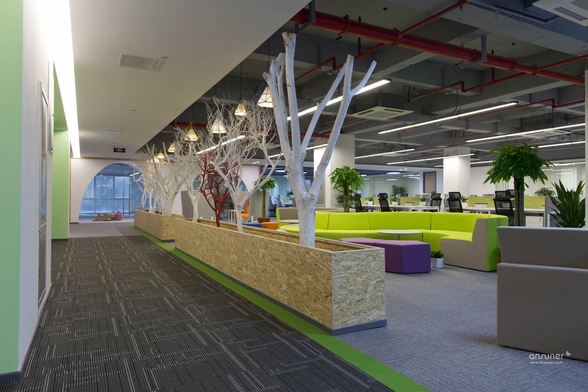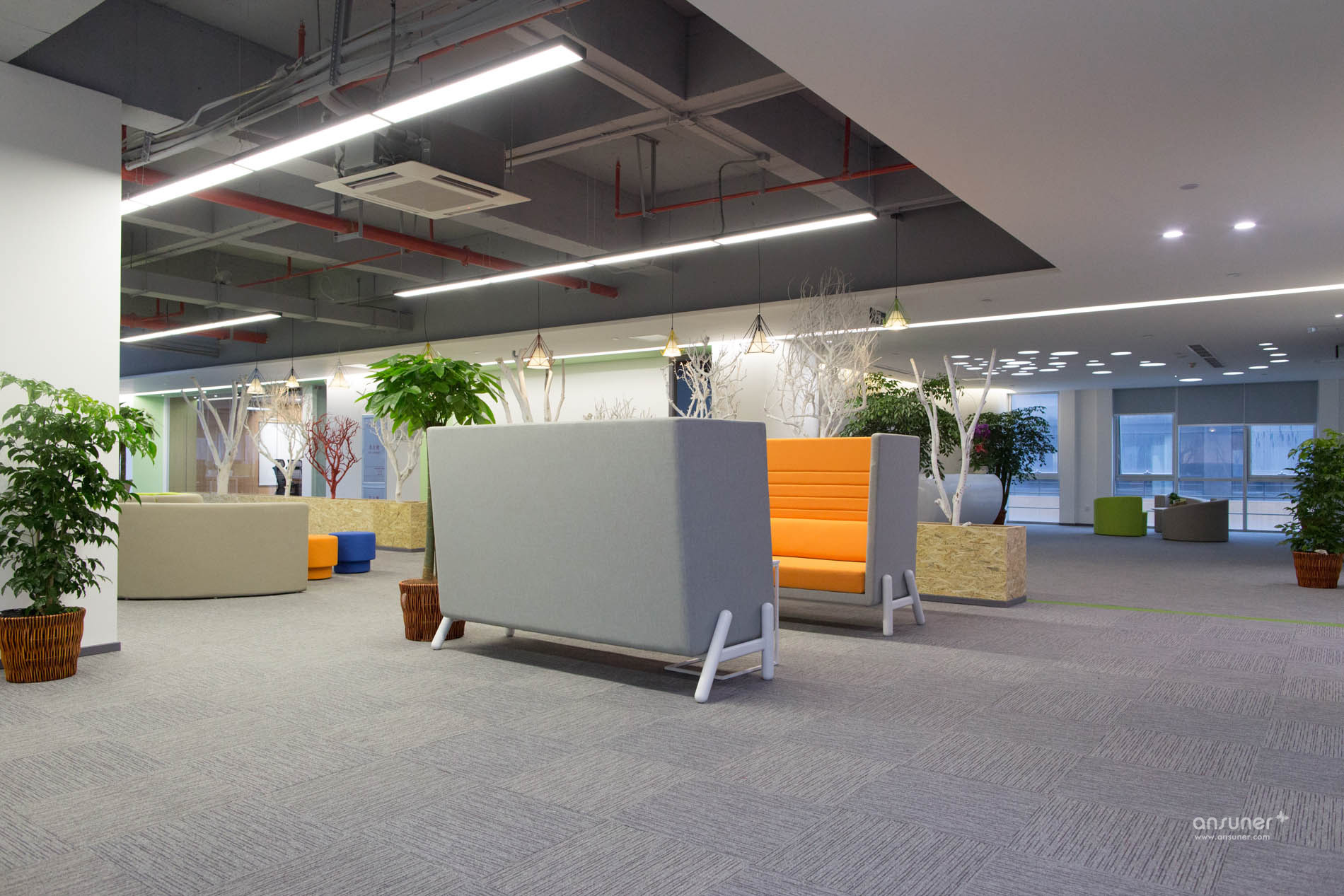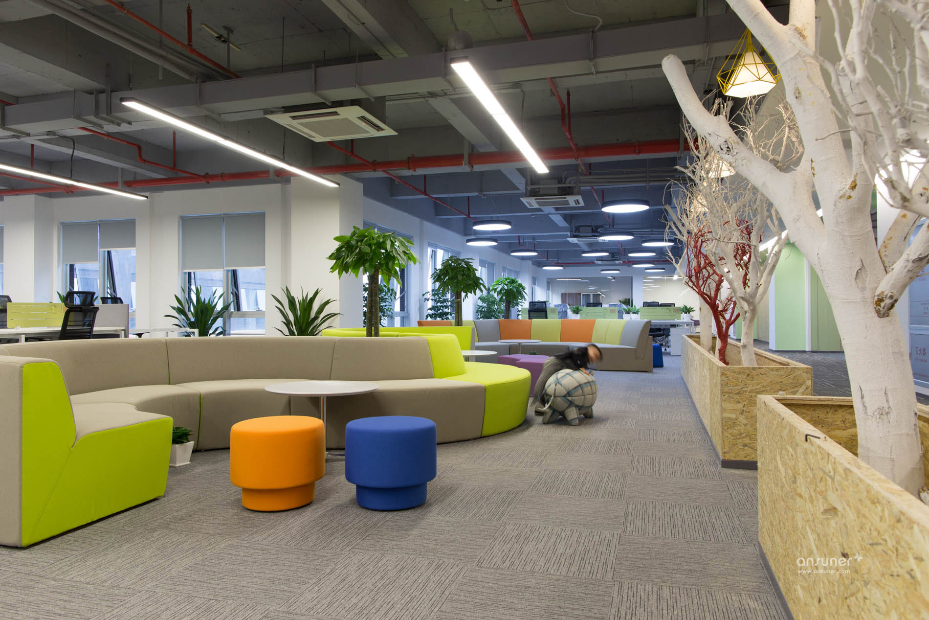 讨论区位于办公区和走道之间,为专注的工作隔开了几分喧嚣,也有益于彼此之间的沟通交流。休闲讨论区放置着弧形的沙发、靓丽的圆椅和可爱的收纳凳,为办公室增加了内容感和趣味性。间隔分布的绿色植物和红色、白色的枯木相对,多了几分自然的感觉。