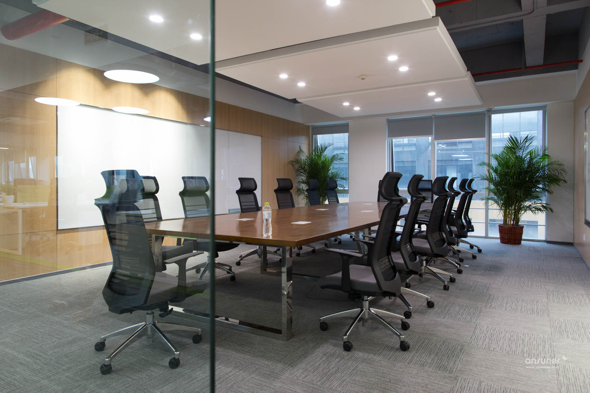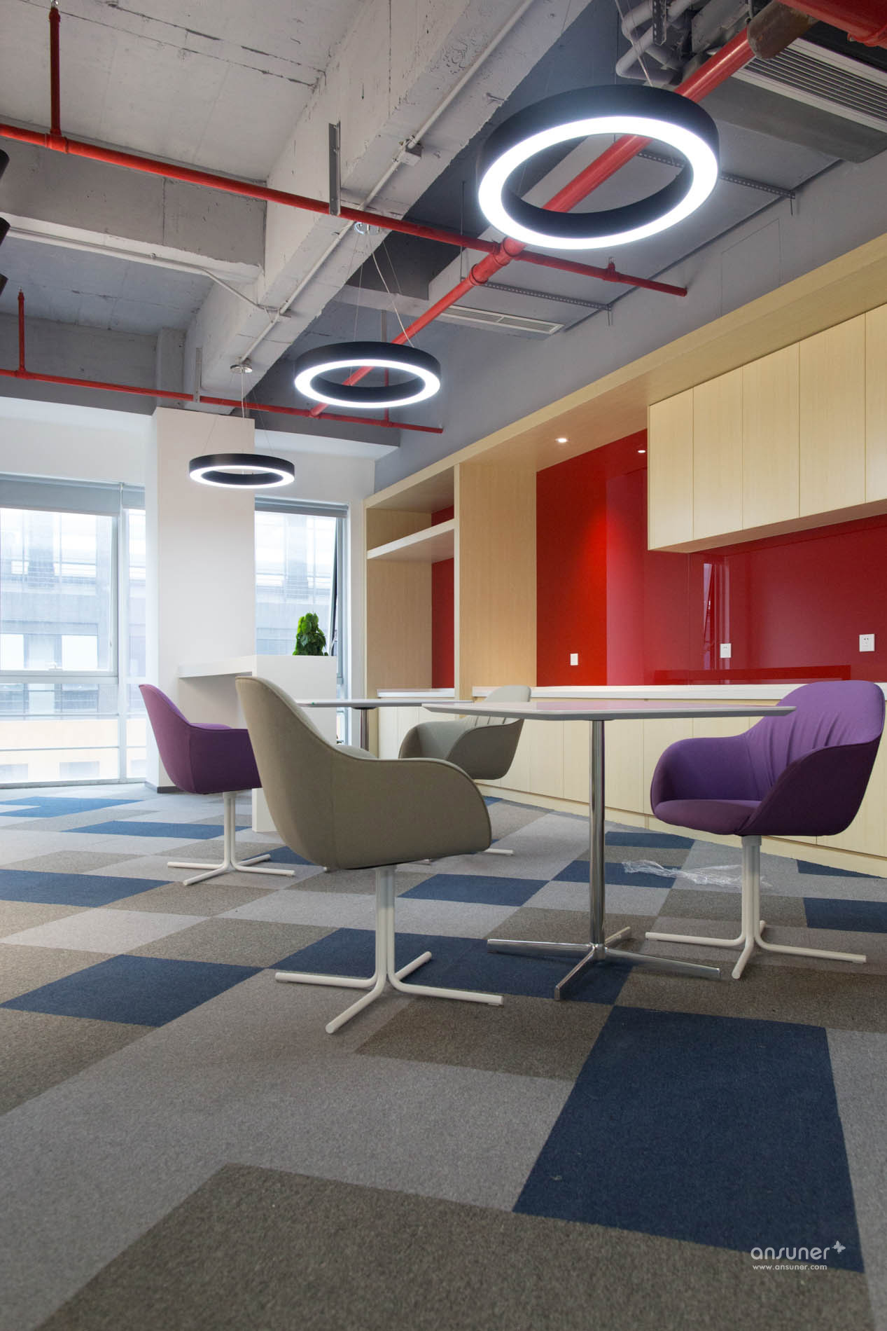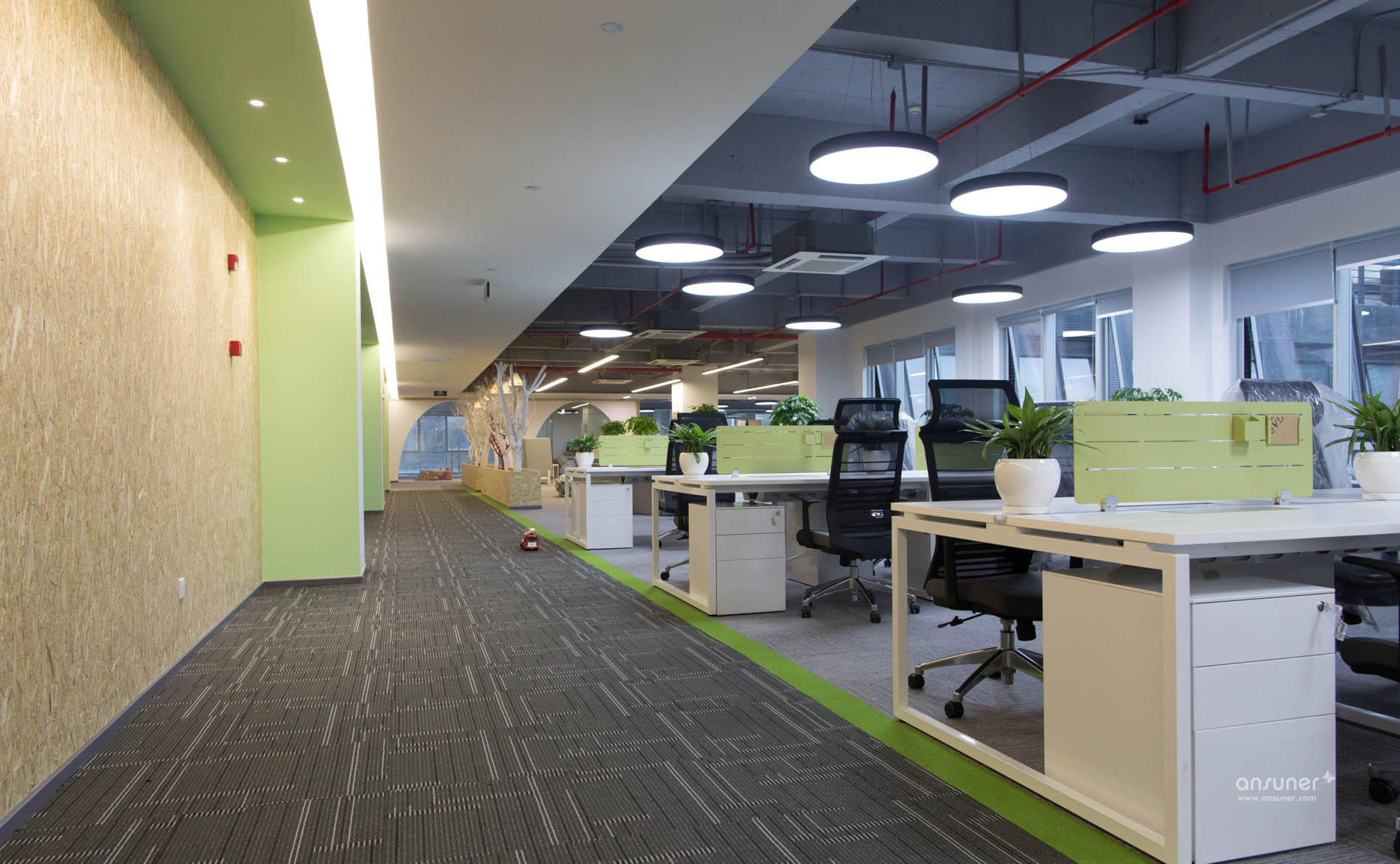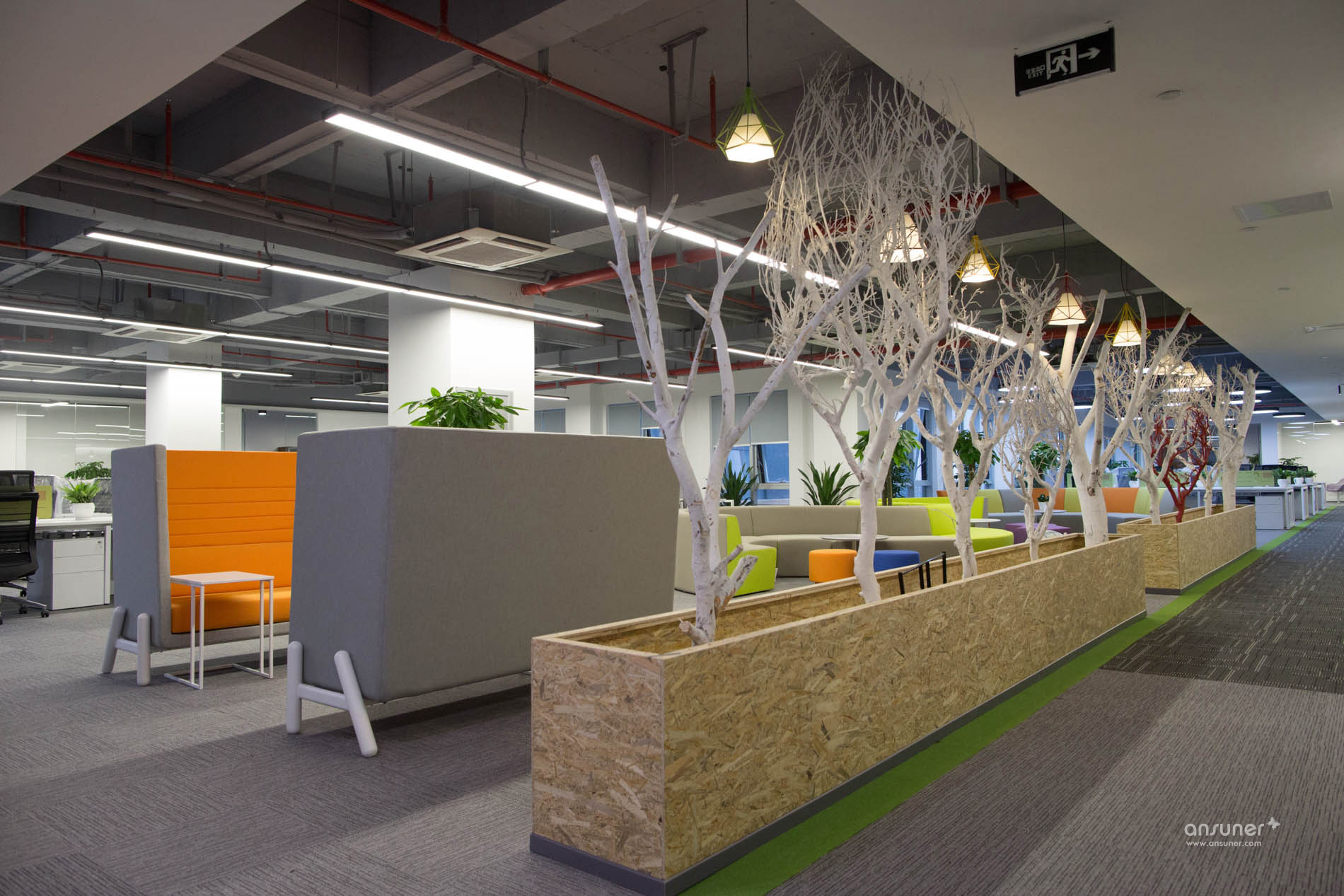 讨论区位于办公区和走道之间,为专注的工作隔开了几分喧嚣,也有益于彼此之间的沟通交流。休闲讨论区放置着弧形的沙发、靓丽的圆椅和可爱的收纳凳,为办公室增加了内容感和趣味性。间隔分布的绿色植物和红色、白色的枯木相对,多了几分自然的感觉。