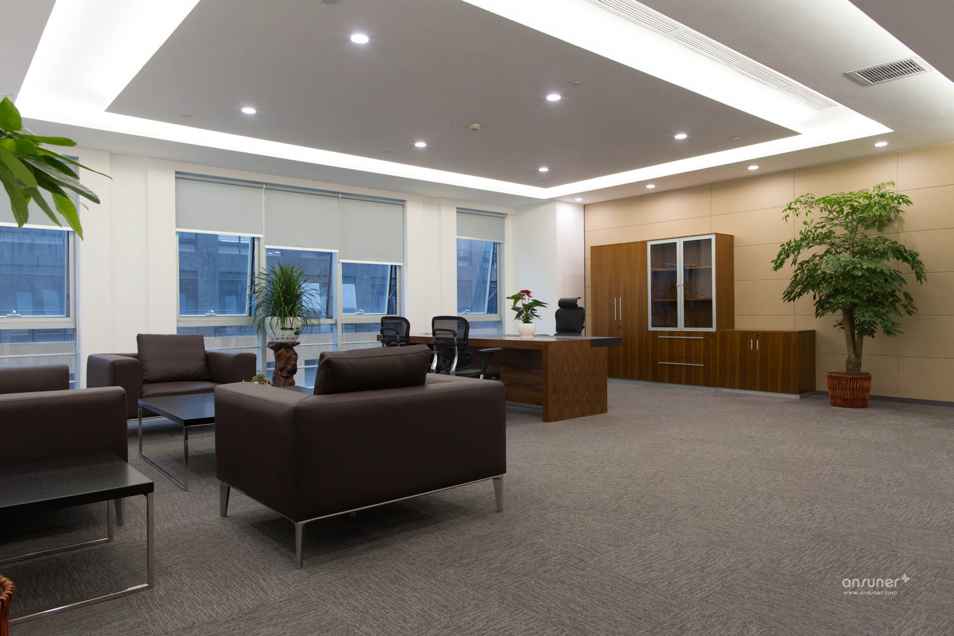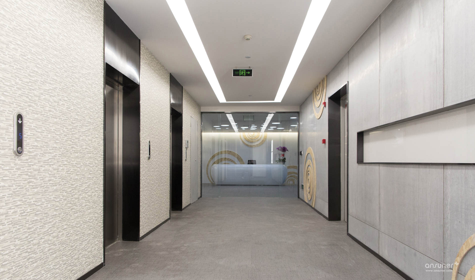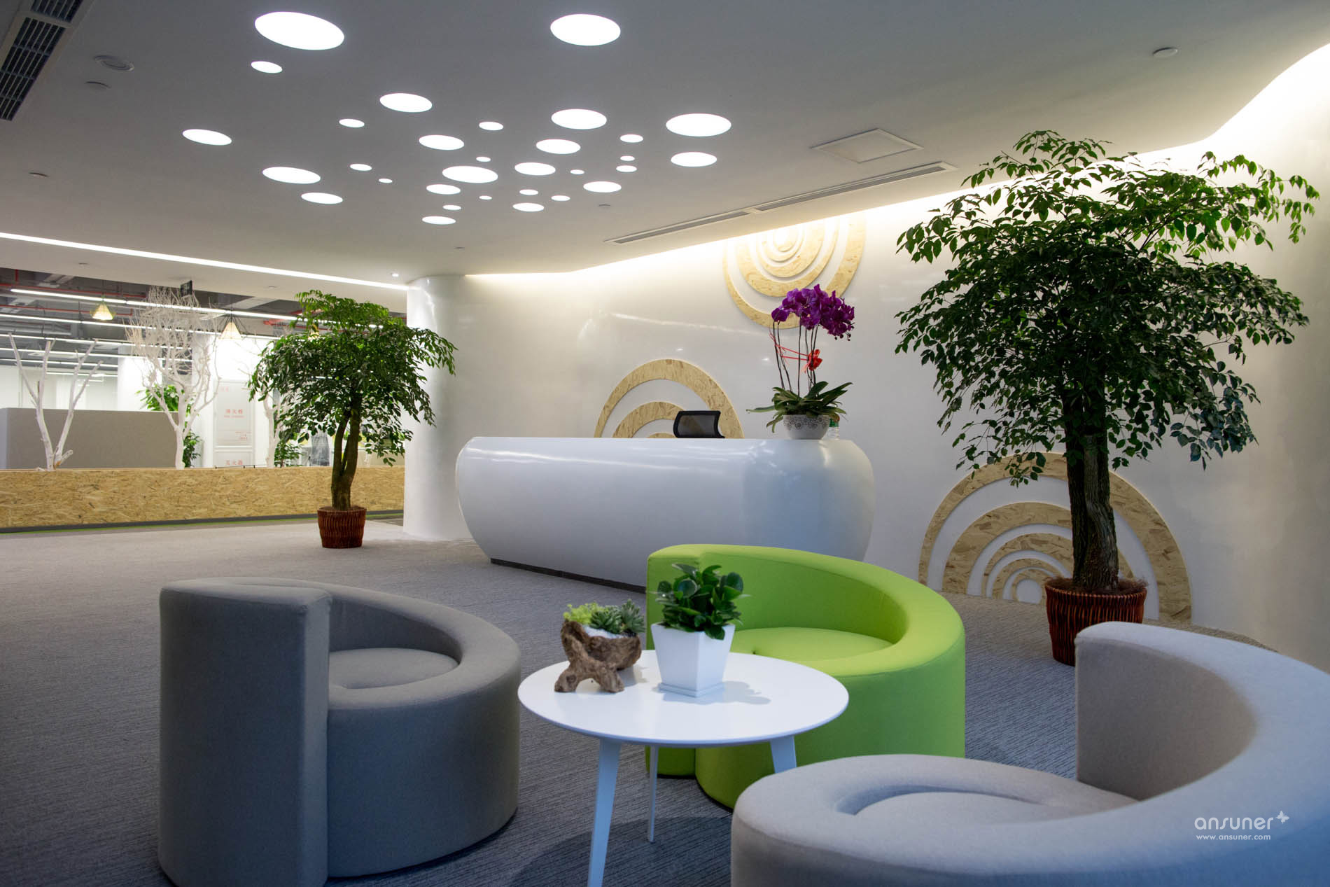 接待台后面的装饰墙上镶嵌着由小及大的圆环,彷如那神秘幽深的银河,是探索的方向。类比的“星空”、“银河”,在形式上做到了既不直白同时又能反映企业相应的特点,增强了对于leyu乐鱼(中国)体育官方网站的体现。