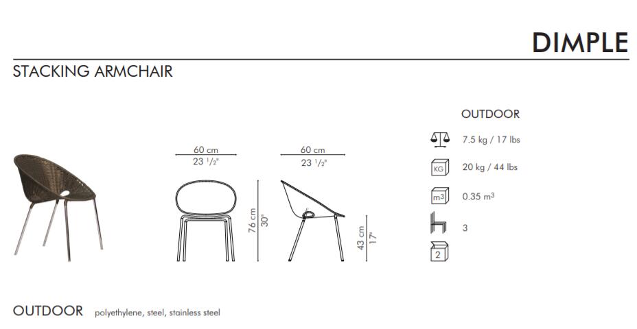 小酒窝扶手椅上的标志性凹痕为户外空间增添了一份微妙的厚脸皮。这些可叠放的椅子由聚乙烯和不锈钢制成,有青铜色。